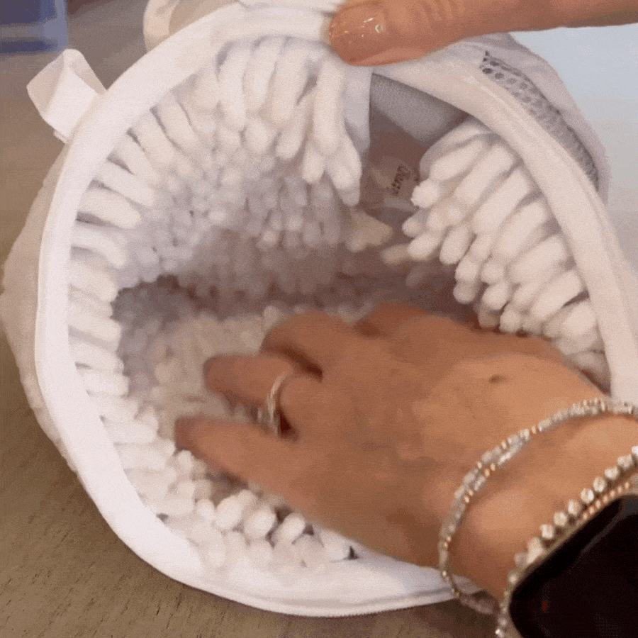 Die flauschigen Chenille-Noppen im Inneren schützen deine Schuhe bei jeder Wäsche. Sie dämpfen Stöße, verhindern Reibung und sorgen dafür, dass deine Sneaker sauber und in Form bleiben.